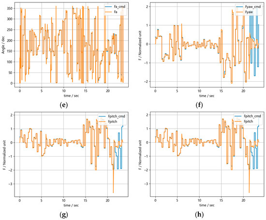 Performance of the joint agents: (a) pressure, (b) nozzle opening, (c) y-axis thrust, (d) z-axis thrust, (e) angle, (f) yaw-axis thrust, (g) pitch-axis thrust, and (h) roll-axis thrust.