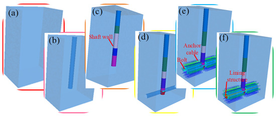 Calculation process of the model: (a) model establishment; (b) shaft excavation; (c) lining support of shaft; (d) excavation of horsehead roadway; (e) bolt and cable support; (f) lining support of horsehead roadway.