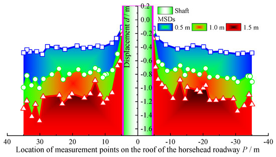 To simulate the secondary consolidation settlement effects associated with hydrophobic water at the shaft’s base, the model’s calculations were terminated upon achieving predetermined MSDs—0.5 m, 1.0 m, and 1.5 m—at the center of the horsehead roadway’s roof, serving as the criterion for halting the simulation. Subsequent analyses of the stress and displacement fields for the model and shaft were conducted at each of these displacement milestones. The spatial distribution curves reflecting the subsidence impact on the surrounding rock of the horsehead roadway’s roof at these respective displacement levels are depicted in Figure 3.