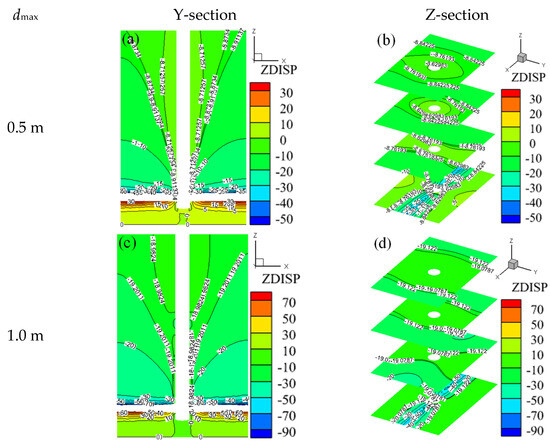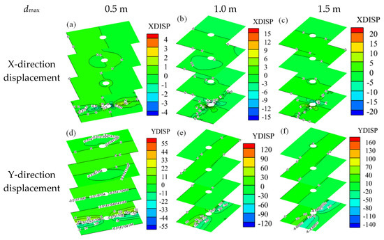 For the model’s X-direction displacement field, a 0.5 m MSD at the horsehead roadway’s roof results in the most pronounced displacement at the shaft and roadway junction, reaching up to 4 cm. This region is characterized by a petal-shaped contour line of high density. Within the X-Y plane at the roadway’s roof level, the X-direction displacement attenuates with increasing distance from the shaft, leading to a more dispersed contour line distribution (see Figure 5a). At a roof subsidence displacement of 1.0 m, the overall pattern of the model’s X-direction displacement field remains consistent with the 0.5 m scenario, yet it exhibits a notable increase in magnitude, with the maximum displacement at the shaft–roadway interface rising to 15 cm, an increment of approximately 10 cm. The contour line density at this juncture is exceptionally high, and the petal-shaped feature enlarges significantly (see Figure 5b). With the roof subsidence displacement advancing to 1.5 m, the displacement at the shaft and roadway connection continues to dominate the model’s X-direction displacement field. Although the displacement pattern aligns with the 1.0 m subsidence displacement scenario, the maximum displacement further escalates by around 20 cm, underscoring a substantial intensification in deformation (see Figure 5c).