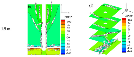 When the horsehead roadway’s roof undergoes the MSD of 1.5 m, the Z-direction displacement ranges from 1.0 to 1.5 m at the point of the roof. The displacement profile exhibits an initial upward extension of approximately 30 m before diverging and tapering off towards the model’s apex, as illustrated by the displacement contour line in Figure 4e. The displacement registered at the model’s summit is approximately 25 cm, aligning closely with one-fifth of the horsehead roadway’s roof MSD. Observations from Figure 4f indicate that, in the vertical sections, the Z-direction displacement contour line shifts from an O-shape at the 100 m and 66 m levels to an X-shape at the 33 m and 0 m levels as the distance from the horsehead roadway’s roof decreases. Moreover, when contrasted with a 0.5 m roof subsidence displacement, the 1.5 m displacement exerts a pronounced effect on the 33 m section. This is characterized by a high relative density of the contour lines compared to the 66 m and 100 m sections, with the peak Z-direction displacement exceeding 25 cm.