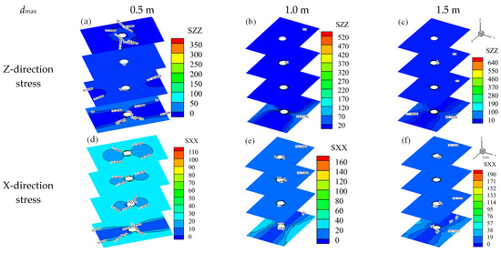 In the Z-direction stress field of the model, the MSD of 0.5 m at the horsehead roadway’s roof manifests a stress concentration around the shaft, with contour density and magnitude increasing nearer to the roadway. Here, the peak stress approaches 200 MPa at the shaft–roof interface. The stress contours diverge horizontally and align with the roadway’s orientation. Beyond this focal area, the Z-direction stress within the rock mass stabilizes between 15 MPa and 20 MPa, akin to the gravitational load (15.8 MPa) applied at the model’s summit, suggesting minimal influence from the roadway’s roof subsidence at these locations (see Figure 6a). With a subsidence displacement of 1.0 m at the roadway’s roof, the stress field pattern resembles that observed at 0.5 m subsidence, but the maximum stress at the shaft–roof junction escalates to approximately 240 MPa. Beyond a 33 m radial distance from the roadway, the stress imparted on the shaft diminishes to below 60 MPa. Within the rock mass, Z-direction stress levels range from 20 MPa to 30 MPa, representing a marked increase from the 0.5 m subsidence scenario (see Figure 6b). At a subsidence level of 1.5 m for the roadway’s roof, the peak Z-direction stress intensifies to nearly 280 MPa. However, similar to previous observations, the stress on the shaft beyond 33 m remains under 60 MPa, and within the rock mass, stress persists within the range of 20 MPa to 30 MPa (see Figure 6c).