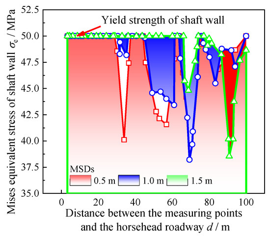 As depicted in Figure 13, the distribution of Mises equivalent stress along the shaft wall was analyzed for MSDs of the horsehead roadway’s roof at 0.5 m, 1.0 m, and 1.5 m. The results show that the Mises equivalent stress on the shaft wall does not exceed 50 MPa, regardless of the subsidence displacement magnitude. This observation correlates with the material properties of the C50 concrete lining employed in the shaft wall construction, which has an approximate strength of 50 MPa (refer to Section 2.2). Hence, when the Mises stress reaches the threshold of 50 MPa, it signifies the onset of plastic deformation and potential failure at that location of the shaft wall [12,39,42]. Consequently, the analysis indicates that the widest yield range in the shaft wall corresponds to a subsidence displacement of 1.5 m, with a plastic yield state extending up to 63 m above the horsehead roadway.