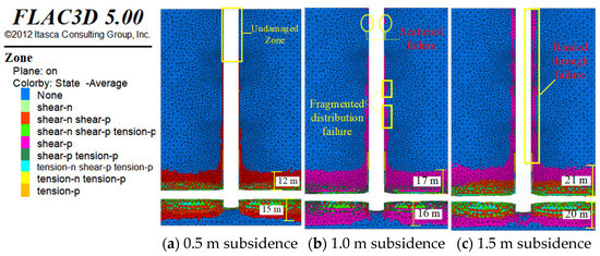 Upon reaching subsidence displacements of 1.0 m and 1.5 m in the horsehead roadway, a more pronounced intermittent pattern of plastic yield emerges along the upper portion of the shaft wall, with exceptions noted in the intervals at 35–40 m, 45–62 m, and above 65 m from the roadway’s roof, where no plastic failure is observed. Conversely, plastic failure is evident at 40–45 m and 62–65 m from the horsehead way, which, as per Table 1, corresponds to mudstone strata (highlighted in bold in the table). This suggests that the weaker mechanical properties and lower load-bearing capacity of these mudstone layers contribute to significant deformation, heightening the risk of shaft wall damage. Notably, the extent of the plastic yield intervals is reduced when the subsidence displacement reaches 1.5 m compared to 1.0 m. This observation substantiates the premise that greater subsidence displacement of the horsehead roadway’s roof correlates with an expanded damage zone within the shaft.