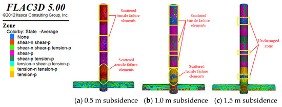 Element extraction from the model, as illustrated in Figure 14, facilitated the visualization of the shaft’s three-dimensional failure mode depicted in Figure 15. At a 0.5 m subsidence displacement of the horsehead roadway’s roof, tensile failure within the shaft wall occurs sporadically across the upper and middle sections of the shaft, as indicated by the rectangular box in Figure 15a, and exhibits a concentrated pattern near the junction with the horsehead doorway (elliptical box in Figure 15a). When subsidence displacement increases to 1.0 m, the tensile failure assumes a stratified configuration in these same areas of the shaft (rectangular box in Figure 15b), transitioning from the previously observed sporadic pattern. Notably, the shaft–wall junction with the horsehead roadway experiences extensive tensile failure (elliptical box in Figure 15b), a marked contrast to the conditions at the 0.5 m displacement level. At the 1.5 m subsidence displacement, tensile failure extends to the lower sections of the shaft as well, manifesting in a stratified distribution throughout the upper, middle, and lower regions (rectangular box in Figure 15c) and intersecting with shear failure zones. Furthermore, the shaft exhibits widespread plastic deformation, with the exception of the area enclosed by the rectangular box (refer to Figure 15c).