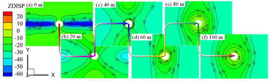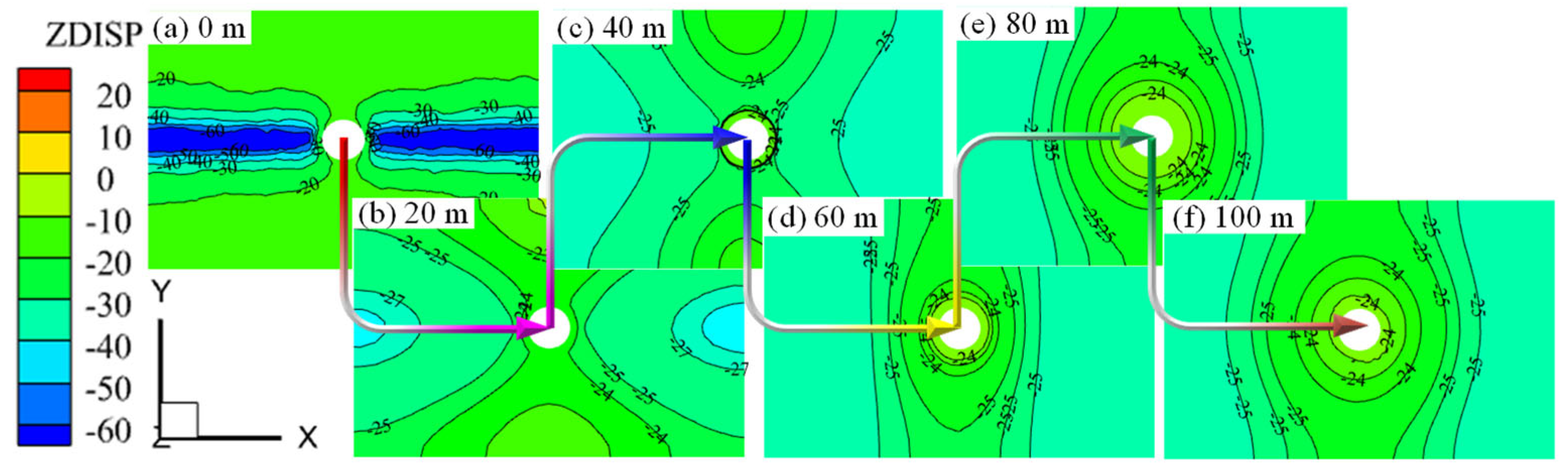 In the model’s Y-direction displacement field, for the MSD of 0.5 m at the horsehead roadway’s roof, the displacement is predominantly localized along the roadway’s axial position, peaking at 55 cm. Axial variations within this region are minimal. However, at the X–Y plane of the roadway’s roof, the Y-direction displacement diminishes with increasing lateral distance from the axis, and the contour lines correspondingly become less dense, as illustrated in Figure 5d. Beyond a 33 m vertical distance from the roadway’s roof, the horizontal displacement changes in both X and Y-directions are negligible. At a subsidence displacement of 1.0 m for the roadway’s roof, the Y-direction displacement remains concentrated along the axial position, with the maximum value surging to approximately 110 cm, double the displacement observed at 0.5 m. The pattern of negligible displacement changes horizontally beyond the 33 m vertical threshold persists at this increased subsidence level, as depicted in Figure 5e.