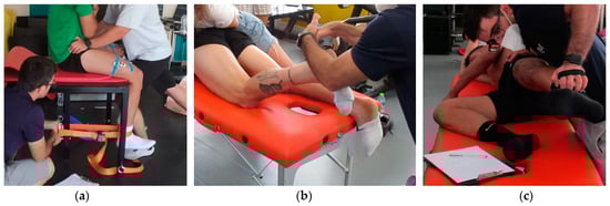 Strength test configuration with handheld dynamometer. (a) Quadriceps strength test; (b) hamstrings strength test; (c) abductors strength test.
