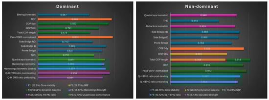 For non-dominant lower limb, the correlation matrix resulted in five factors, explaining 76.60% of the variance (Table 3). The first factor accounted for 22.19% of the total variance in the datasets. The results indicated that factor 1 (F1) was positively correlated with prone bridge and dominant side bridge, non-dominant side bridge, and triple hop: thus, this first factor could be named “core stability”. The second factor (F2) represented 20.35% of the total variance and was positively correlated with COP length, COP SDx, and COP SDy. Thus, this factor could be named “dynamic balance”. The third factor (F3) accounted for 13.78% of the total variance and was positively correlated with VGRF and RDF. F3 could be referred to as “force attenuation”. The forth factor (F4) accounted for 10.12% of the total variance and was positively correlated with Q–H EMG ratio pre-landing and Q–H EMG ratio post-landing. Thus, this factor could be named “Q–H EMG ratio”. Finally, the fifth factor (F5) represented 8.13% of the total variance and was positively correlated with quadriceps and abductors (QD-ABD) strength. Thus, F5 could be referred to as “strength”. The results of the factor analysis of both lower limbs are presented in Figure 3.