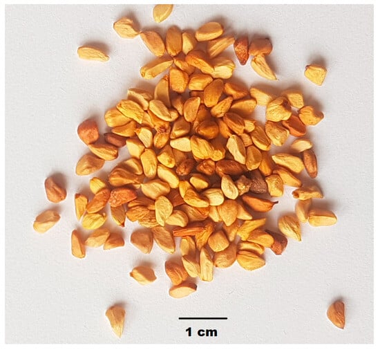 The seeds were obtained from harvest in 2021 and purchased from H.J.C. Polecki Trading (Śrem, Poland). Their country of origin was Ukraine. The seeds were obtained following the separation of the hypanthium and brought to a moisture content of 10% (Figure 2). The 1000 seeds’ weight was determined by counting 200 seeds three times, weighing them to the nearest 0.01 g, and calculating the result per 1000 seeds. Dry matter was determined following milling of the seeds, using the Ohaus MB27 moisture analyzer (OHAUS, New Jersey, NJ, USA) at 105 °C. The swelling index was determined according to European Pharmacopoeia 9.0 [13], i.e., by determining the volume in milliliters occupied by one gram of the plant substance following swelling in an aqueous solution for 4 h, together with the adhering mucilage. The results of all measurements were given as arithmetic means from three replicates, and the standard deviation was determined.