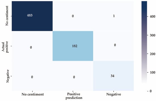 Figure 6 illustrates the correct and incorrect predictions made by the model. For the no sentiment category, represented by the number 483, the model accurately classified 483 instances as having no sentiment. However, the model misclassified one example, which was actually positive, as no sentiment. In the positive category, the model correctly identified 182 instances. Nevertheless, 34 cases that were actually negative were incorrectly predicted as positive. This confusion matrix provides an overview of the model’s performance detecting sentiment within the test data. While the model demonstrates high accuracy, particularly in identifying the no sentiment category, there is still room for improvement in classifying both positive and negative instances.