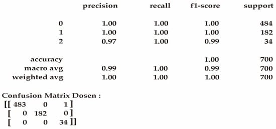 Figure 7 shows the classification report for the lecturers, which includes various evaluation metrics. This report covers precision, recall, F1-score, and support for each class. In class 0, the precision, recall, and F1-score are recorded at 1.00, with the backing of 484 documents. Class 1 shows similar results, where precision, recall, and F1-score also reach 1.00 with support from 182 documents. Meanwhile, for class 2, there is a slight decrease in precision, which reaches 0.97, but recall and F1-score remain high at 1.00 and 0.99, with support from 34 documents. In addition, the overall model accuracy reaches 1.00, indicating that the model is highly effective in classifying the data. The macro-average and weighted average also show similar results, with values of 0.99 and 1.00, indicating excellent performance. The confusion matrix shows that the model classifies well for classes 0 and 1, while some errors are observed in class 2, identified by the number of misclassified predictions.