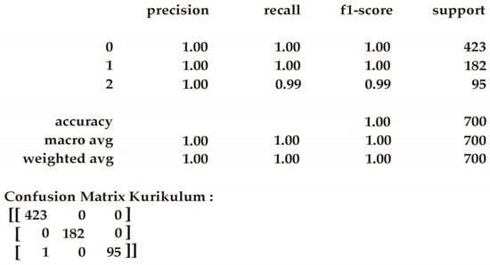 Figure 8 shows the classification of the Curriculum aspect. This classification model demonstrates excellent performance, with precision, recall, and F1-score nearly perfect for each category, similar to the results in the Lecturer aspect. The overall accuracy reaches 100%, and the confusion matrix shows the model’s ability to predict accurately with minimal errors.