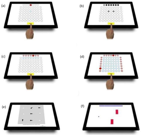 Test2Drive is a modern device that is clear and intuitive for the test participant. The tests are conducted using an online-connecting computer equipped with a touch monitor. The use of the touchscreen monitor makes it possible to replace the elaborate traditional apparatus, which significantly reduces the examination time. The entire examination with a complete battery of tests is carried out at one station. All tests of the Test2Drive system were preceded by a practice phase after which the test participant proceeded to the main test. Immediately after the examination, the participant had access to the reports and protocols of the results. The system is standardized with tables of norms. The report includes raw scores, as well as normalized results presented on a sten scale. Figure 1 shows 6 tests assessing psychomotor ability such as reaction time, movement time and correct response in SIRT, CHORT, HECOR, SPANT, PUT and PAMT tests. The compatibility and effectiveness of Test2Drive are confirmed by previous studies, making it an effective replacement for conventional psychological tests [21,42,43,44]. Simple reaction time (SIRT)—in a standing position, the participant’s task is to move the forefinger from one box on the screen to another in response to a stimulus. All stimuli are identical, presented at random intervals. The test measures reaction time (from the stimulus to lifting the finger from the resting field) and movement time (movement time to the reaction field). The median reaction time and median motor time are therefore evaluated. Choice reaction time (CHORT)—in a standing position, varying responses are required of the participant—depending on the displayed pattern, the participant must touch the appropriate box or hold back from reacting. In addition to reaction and movement time, an important variable is the percentage of correct reactions, indicating the effectiveness of inhibition processes. HECOR (hand–eye coordination) measures eye–hand coordination. The participant has to press the box under the presented stimulus. The test is a development of the idea of the classic Piórkowski apparatus. The variables are reaction time and movement time. SPANT (spatial anticipation test) was also designed to measure eye–hand coordination. The SPANT test involves tapping a box at the intersection of the row and column indicated by the signal. In these tests, the variables are reaction time, movement time and the percentage of correct responses. SPANT is the most complex task testing psychomotor performance. PUT (pop-up test) is based on Anna Treismann’s trait-integration concept. The task involves searching a set of elements for an object defined by a conjunction of features. It allows for the assessment of visual search speed and attentiveness. The participant was instructed to select the black triangle pointing either vertically upward or downward. If no such triangle appeared, the participant was to click the "NONE" button located in the bottom-right corner to proceed to the next stage. The perception–anticipation of movement test (PAMT) involves evaluating the movement of objects and making decisions at the right moment. The result of the test is the percentage of correctly performed tasks. The participant was required to touch an object using the index finger in such a way that it would avoid collision with other objects while moving horizontally across the board. The tests were selected to correspond to the specifics of the profession that female and male handball players face. During a handball match, handball players make a significant number of decisions in offensive and defensive actions where reaction time can be key to achieve the individual and team goal.