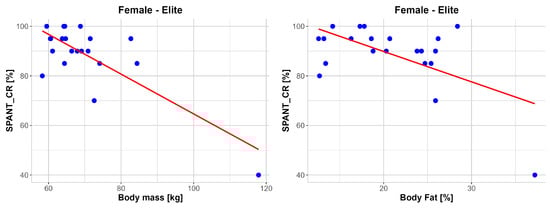 Figure 2 presents the correlations between body mass [kg], body fat [%] and percentage of correct answers in the SPANT Cr [%] test. The blue dots on the chart illustrate the individual results of the athletes, while the red line represents the overall trend line, showing the general tendency. Among elite female athletes, a statistically significant negative correlation (p < 0.05) was observed for both of the above cases. High strength correlations, for body mass (r = −0.78) and body fat (r = −0.58), indicate that an increase in body mass and body fat content decreases the number of correct answers on the SPANT cr test.