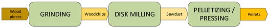 As shown in Figure 1, the pelletization process (transformation of wood pieces into pellets) consisted of three basic steps: grinding, milling, and pelletizing. First, once dried, wood pieces are transformed into chips by means of a process of hammer milling or grinding that produces woodchips of a large size. Then, by means of a disk mill, chips are reduced in size and converted into sawdust. Finally, by using a pellet machine, the sawdust is pressed and converted into pellets. As a result, cylindrical pellets with a diameter between 6 and 8 mm and a length from 10 to 30 mm were obtained.
