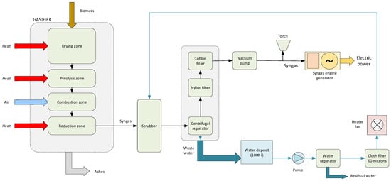 Process diagram to produce syngas from biomass in a downdraft gasifier. Source: own elaboration based on [38,39].