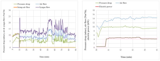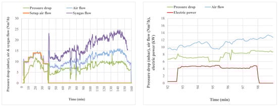 During Test 1, the air flow changed from 8 to 16 Nm3/h. The gasifier was turned on and, after 50 min, the engine (ICM-generator block) was also turned on. There was no observed increase in water in the filter, and the pressure drop was steady. Therefore, amendments implemented in the gasification facility, described in Section 3.2, provided positive results, with pressure drop increments in the range of pressures established by the literature, between 8 and 12 mbar (Figure 6 left).