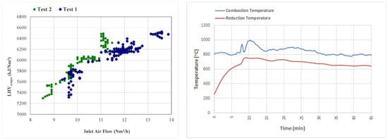 According to Figure 8 (left), the variation in the inlet air flow rate in Test 2, from 8.5 to 11.5 Nm3/h, produced a variation in the LHV of the syngas from 5.3 to 6.5 MJ/Nm3. Similarly, in Test 1, a variation in the inlet air flow between 9.64 Nm3/h and 13.87 Nm3/h produced a lower heat value varying between 5.3 and 6.5 MJ/Nm3. Consequently, for a variation in flow between 8.50 and 11 Nm3/h, the LHV of syngas ranged between 5.3 and 6.57 MJ/Nm3, giving an average value of 5.95 MJ/Nm3, which is in the order of magnitude of the result obtained by other researchers in similar applications [40].