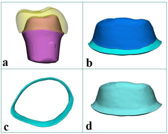 The evaluation of marginal and internal adaptation using a triple-scan protocol. (a) Image of the cemented crown, (b) gap volume between the scanned crown and die, (c) marginal gap volume, and (d) internal gap volume.