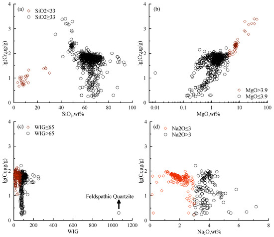 Of the 138 samples, 10 carbonatite rock samples from Jin et al. [35] had WIG values larger than 120, which is not suitable for Equation (2). Therefore, 128 samples were tested on Equation (2), reported by Gong et al. [24], and their results are illustrated in Figure 3b. The 50 soil samples from An et al. [36] were all well predicated with the logarithmic error of ±0.2. However, the 78 rock samples from Delavari et al. [33] and Taniuchi et al. [34] were clearly outside of the logarithmic error of ±0.2, indicating the unsuitability of Equation (2).