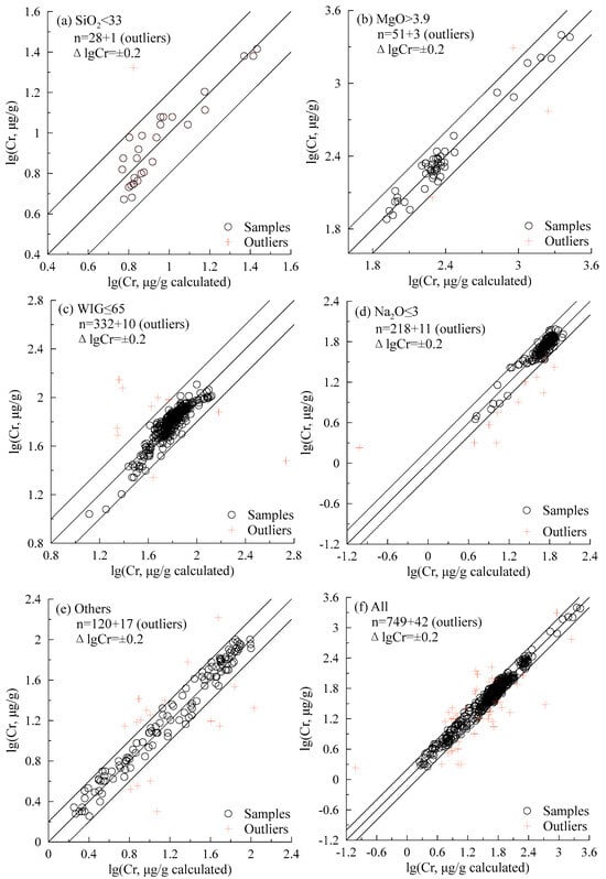 where the oxide contents are given in weight percent (%), and Cr and Ti are in units of μg/g. Unlike traditional methods, this approach directly calculates the Cr background values based on their major component contents, irrespective of data distribution characteristics, and is applicable even for single samples. However, the equation does not apply to samples with WIG ≥ 120. In a dataset of 791 abundance records for rocks, soils, and sediments, treated as virtual background samples, application of Equation (2) revealed that 63 records (those with WIG > 120) could not be calculated. Among the remaining 728 records, 425 displayed logarithmic residuals exceeding ±0.2 between calculated and observed values, accounting for 58.4% of the total. Consequently, Equation (2) requires refinement to improve its representativeness of Cr geochemical background values in geological samples.