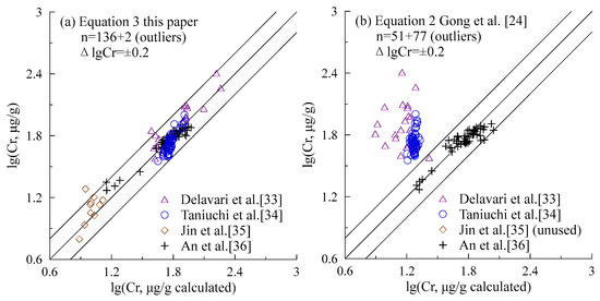 With respect to the results of the 138 samples calculated with Equation (3), 136 samples were located within the logarithmic difference range of ±0.2 (Figure 3a), accounting for 98.6% of the total samples (Table 3). Specifically, for the 20 rock samples from Delavari et al. [33], Cr geochemical background values were calculated using Equations (3b), (3d) and (3e), with logarithmic residuals ranging from −0.11 to 0.26. Except only one outlier, the other 19 samples were within the logarithmic difference range of ±0.2, accounting for 95%. The 58 rock samples from Taniuchi et al. [34] were assessed with Equations (3b) and (3e), yielding logarithmic residuals between −0.15 and 0.10, with a fitting accuracy of 100%. For the 10 carbonatite samples from Jin et al. [35], Equation (3a) was used. Except only one outlier with a logarithmic error of 0.36, the others derived logarithmic residuals ranging from −0.09 to 0.17, with a fitting accuracy of 90%. For the 50 soil samples from An et al. [36], Equations (3c) and (3d) were applied with logarithmic residuals between −0.13 and 0.20, indicating an accuracy of 100%. In summary, the five sub-equations of Equation (3) were all tested on the 138 samples, where Cr concentrations ranged from 6.3 to 256 μg/g with an accuracy of 98.6% on the criterion of logarithmic error of ±0.2.