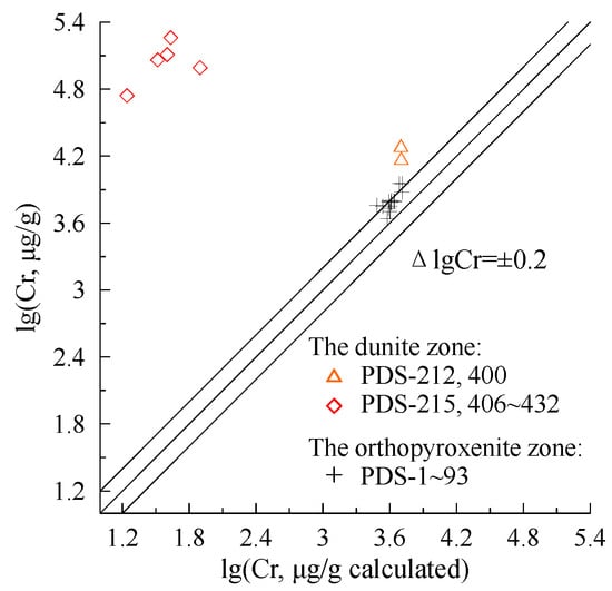 Fifteen samples from the orthopyroxenite zone (PDS-1 to PDS-93) were slightly altered (Table 4), and their geochemical background values were close to their analytical values based on the criterion of ±0.2 logarithmic deviation (Figure 4), although five samples fell outside of the error range with logarithmic residuals between 0.21 and 0.27. If the suggested criterion of ±0.2 logarithmic deviation was adopted here, 10 samples would be normal and the other 5 anomalies. The five anomalous samples were also close to the normal samples due to minor residuals. This judgment is supported by MacLean’s [47] assertion that slightly altered rocks can retain compositions similar to their original state.