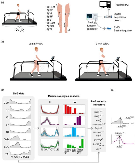 (a) Setup of the experimental protocol. From left to right: participants walked for 2 min on a sensorized treadmill to record comfortable speed and cadence; electrode placement on each participant’s dominant leg; synchronization between devices by means of an analog signal delivered in parallel to the treadmill computer and the Sessataquattro+ EMG recorder. (b) Experimental protocol: participants walked for 2 min on a sensorized treadmill under two conditions: walking with arms (WWA) and walking with no arms (WNA). (c) Example of the electromyographic (EMG) analysis and extraction of muscle synergies. From left to right: EMG envelopes of the eight measured muscles; four synergies extracted (red Syn 1, purple Syn 2, blue Syn 3, green Syn 4); and performance indicators extracted from the EMG data and muscle synergies. (d) Schematic representation of , ,  and (), all explained in the Supplementary Material (Table S1). GLM, Gluteus Medius; RF, Rectus Femoris; VL, Vastus Lateralis; BP, Biceps Femoris; ST, Semitendinosus; GaM, Gastrocnemius Medialis; SOL, Soleus; TA, Tibialis Anterior; ref., reference electrode; W and H, matrices that represent the spatial time-independent and the time-dependent coefficients of a synergy, respectively.