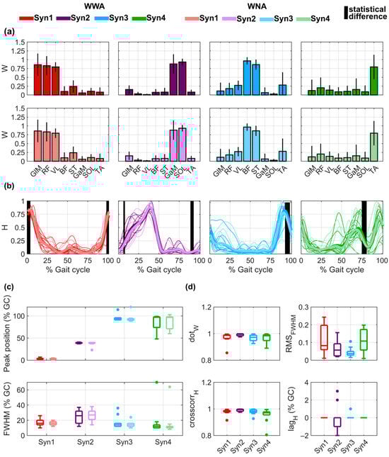 Muscle synergy components extracted for walking with arms (WWA) and walking with no arms (WNA), considering four synergies (Syn 1, Syn 2, Syn 3, Syn 4). (a) Mean ± std of the spatial time-invariant coefficients (W) during WWA (upper plots) and WNA (lower plots). (b) Time-dependent coefficients (H) for all subjects (thin lines) and mean of all subjects (bold lines). Vertical black lines show the statistically significant differences between WWA and WNA. (c) Distribution of the peak position () as a function of the gait cycle (GC) (upper plot) and full width at half maximum (FWHM) (lower plot). (d) Distribution of the dot product (), root mean square error (), cross-correlation (), and  between WWA and WNA, for each H.