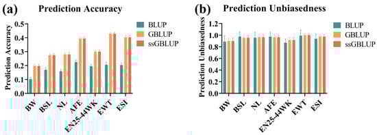 Figure 2. Predictive performance of BLUP, GBLUP, and ssGBLUP models for growth, reproductive, and egg quality traits in Pekin ducks: (a) predictive accuracy for each trait using different models; (b) predictive unbiasedness for each trait using different models. The predictive performance of BLUP, GBLUP, and ssGBLUP is represented by green, orange, and red bars, respectively. BW, body weight at 6 weeks of age; BSL, body slope length; NL, neck length; AFE, age at first egg; EN25-44WK, egg number from 25 to 44 weeks of age; EWT, average egg weight at 40 weeks of age; ESI, average egg shape index at 40 weeks of age.
