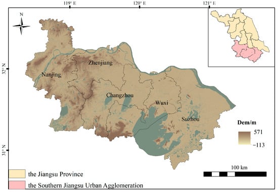 The Southern Jiangsu urban agglomeration is situated between 30°47′ N–32°37′ N and 118°22′ E–121°20′ E. The urban agglomeration covers five cities: Zhenjiang, Nanjing, Changzhou, Suzhou, and Wuxi; the total area is 28,085.36 km2; the region has a subtropical humid monsoon climate [44]. In the western region, the terrain is characterized by significant undulations, mainly consisting of low mountains and hills; in contrast, the eastern region is predominantly flat, with a dense network of waterways (Figure 1). As a pioneer and exemplary model of China’s modernization construction, the Southern Jiangsu urban agglomeration boasts both high per capita income and urbanization rates. In this region, land use is primarily focused on farmland, while the quantity of water resources and forest resources is relatively limited and their spatial distribution is uneven. In the western region, there is a significant shortage of water, while in the eastern region, there is a lack of contiguous forest land [45]. In addition, intensive land development and exploitation have resulted in the replacement of some natural land with built-up land, leading to the destruction of numerous habitats and the fragmentation of biological habitats; this has also caused a significant reduction in the area of wetlands such as lakes and weakening of the functionality of ecological corridors such as river systems. These issues have become significant factors affecting the protection of national land space and the restriction of economic development in this region [44].