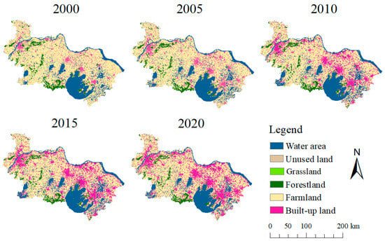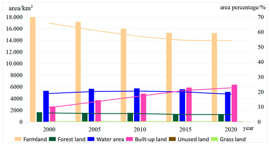As shown in Table 5 and Figure 3, the land use in the study area is primarily composed of farmland, water areas, and built-up land. Among these, farmland remains the largest land use type, accounting for 65.88% of the total area in 2000, though its proportion decreased to 54.21% by 2020. Built-up land and water areas follow, constituting 22.64% and 18.39% of the total area in 2020, respectively.