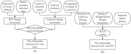 Ecosystem services (ESs) refer to the advantages that humans obtain from ecosystems, which include cultural services, provisioning services, supporting services, and regulatory services [1,2,3]. As the environmental conditions and utility foundation upon which humans rely for survival and development, ecosystems impact human society while also being influenced by human activities [4]. ESs are a tangible manifestation of land use structure and function, where land use types and structure represent the pattern of ecosystem products and services. In recent years, the relentless advance of urbanization has caused excessive land development and utilization [5], as well as high-intensity transformations in land cover types. These phenomena have severely impacted processes and structures [6,7,8]. Moreover, studies on the future impacts of climate extremes, such as the projected increases in flood events and droughts in regions like the Tar-Pamlico River basin in North Carolina, further highlight the importance of considering spatiotemporal variation characteristics of land use and ESV for regional land intensive use and ecological security [9]. Therefore, conducting research on the spatiotemporal variation characteristics of land use and ESV is of great significance for regional land intensive use and ecological security guarantee [10,11]. This can provide theoretical and methodological support for improving regional resource utilization efficiency, formulating ecological compensation, and developing land and spatial planning and land consolidation policies [12].
