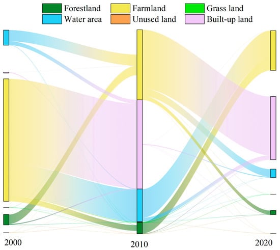Sankey diagram of land use type area transfer from 2000 to 2010 to 2020.