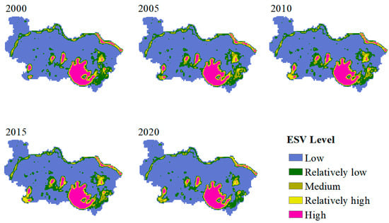 As shown in Figure 6, the ESV’s spatial layout within the Southern Jiangsu urban agglomeration showed a considerable degree of consistency between 2000 and 2020, exhibiting a characteristic pattern of higher values in the east and lower values in the west. Notably, the regions with higher ESV are predominantly situated in the eastern sector of the urban cluster, particularly in areas around water bodies such as Lake Tai. The region is rich in water resources, and the ESs provided by the aquatic systems are relatively strong, resulting in a significantly higher ESV level. The areas with lower ESV are mainly concentrated in the western region of the agglomeration, mainly in areas of farmland and built-up land. This is because the ESV per unit area of farmland is relatively low, and built-up land does not provide ESV. The medium-value and higher-value areas are situated in the far eastern part of the agglomeration. In terms of spatial pattern changes, the medium-value and higher-value areas in the east have gradually been replaced by lower values. This change is primarily closely related to the acceleration of the urbanization process, where urban expansion has led to the conversion of forests, farmlands, and some wetlands into built-up land, thereby weakening the ecological service functions of these areas.