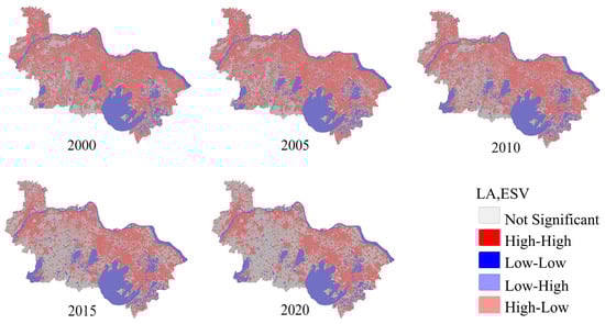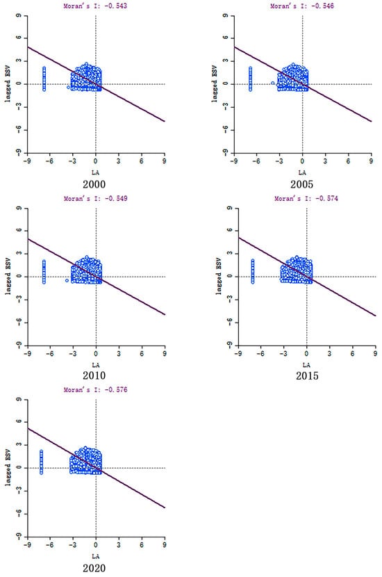 LA can measure the extent of land use within a specified area. A higher LA value indicates a greater degree of land use and higher intensity of human activities, while a lower value suggests a lesser degree of land use and lower intensity of human activities. As shown in Figure 7, the Moran’s I index was negative for the years 2000–2020, with the majority of the scatter plots located in the second quadrant. The index increased year by year, indicating a significant local spatial negative correlation between LA and ESV in the study area, with the correlation strengthening over the years. The cluster map shown in Figure 8 reveals that the clustering patterns over the 20-year period were primarily low–high and high–low patterns. The low–high pattern was mainly distributed in water bodies, while the high–low pattern was predominantly found in built-up land and farmland, showing a distinct characteristic of ESV distribution based on land use types. Areas with lower ESV exhibit a spatial coupling relationship with regions of higher land use intensity, reflecting the erosion of natural ES functions by human development activities.