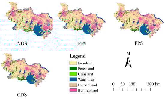 In the four scenario predictions, in the NDS, the land areas allocated to farming, forestry, and grassland are persistently diminishing, negatively affected by urban expansion. In the EPS, an upward trend is evident in the regions designated for farm, forest, and grassland uses, with increases in forest land and grassland in the northern part of Lake Tai and the northern part of the study area, indicating the development of ecological land use. In terms of farmland, the EPS has the largest area of farmland, indicating the greatest protection of farmland in this scenario. Under the CDS, the allocation of areas for farming, forestry, grassland, and other land uses complies with the national land planning regulations, protecting basic farmland and important water areas, and increasing the area of built-up land, taking into account urban development.