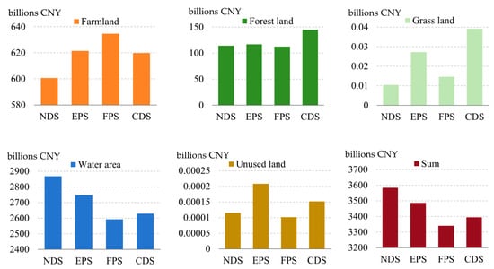 Figure 10 illustrates the changes in ESV for land use types under various scenarios, with the unit being in billions CNY. By land use type, for farmland, the ESV is highest under the FPS at CNY 63.468 billion, followed by the EPS and the CDS, with the NDS having the lowest value. This suggests that the scenario setup is sound and has a high degree of alignment with farmland protection policies. For grassland and forest land types, the ESV under the EPS is the second highest, exceeding the ESV of the NDS and falling below the ESV of the CDS. This indicates that, compared to the NDS, the EPS provides better protection and development for forest land and grassland. Looking at the total ESV, the ranking is as follows: NDS > EPS > CDS > FPS, with specific values of CNY 358.312 billion, CNY 348.616 billion, CNY 339.402 billion, and CNY 333.999 billion, respectively.