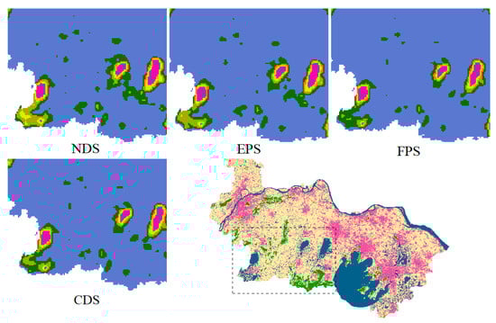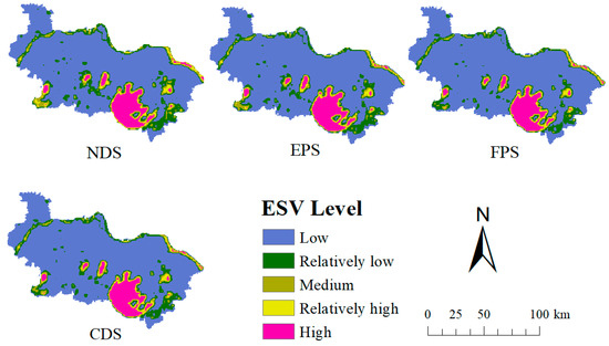 The analysis in Figure 11 indicates that the spatial distribution of ESV under various scenario predictions is generally similar to the actual ESV spatial distribution from 2000 to 2020, displaying a distribution where values peak in the eastern areas and diminish in the western areas. Areas of elevated value are still primarily located in the eastern part of the study area, particularly in water body areas such as Lake Tai; low-value areas continue to be predominantly found in the western part of the agglomeration, mainly in areas of farmland and built-up land. Areas with comparatively lower values are located in the easternmost section of the study region. From Figure 12, it is evident that the differences in ESV distribution under the four scenario predictions are mainly concentrated in the medium and relatively high values, manifested in the study area’s southwestern sector. Specifically, under the NDS and EPS, this region exhibits medium and relatively high ESV distributions, while under the FPS and CDS, the area shows medium and relatively low ESV distributions.