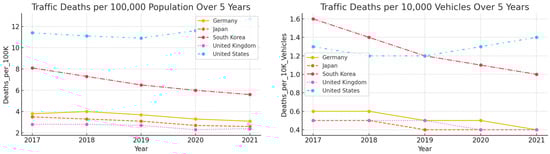As of 2023, South Korea had approximately 26 million registered vehicles, with around 21 million being passenger cars and 4 million trucks. The total annual driving distance is approximately 335.6 billion kilometers, with highways alone accommodating about 8.5 million vehicles daily. In contrast, the total road length is 111,314 km, resulting in a ratio of 4.7 km per 1000 vehicles, which is the lowest among the Organization for Economic Co-operation and Development (OECD) countries. The number of traffic accidents in 2023 was approximately 200,000, with 152,935 being vehicle-to-vehicle collisions and 5017 of these occurring on expressways. Over a five-year period starting in 2017, as shown in Figure 1, South Korea ranked second to the United States among five OECD countries in terms of the number of traffic fatalities per 100,000 people, with a death rate per 10,000 vehicles similar to that of the United States, indicating a high level.