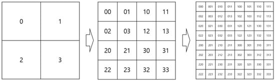 In this study, the research area was spatially divided using the geohash algorithm, which grids and encodes the target area into strings, creating a hierarchical grid map through successive quartering (2 × 2) of the space. Figure 2 illustrates this spatial division method. The first image shows the area divided into four sections, each assigned a base-4 identifier. Each of these sections was subsequently divided further, with a new base-4 identifier assigned in sequence, following the initial IDs. This method repeatedly divides an area into four parts. For this study, the geohash algorithm was applied to divide the area spanning 126° to 130° longitude and 34° to 38° latitude in Korea.