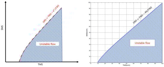 Regarding this analysis, the left graph in Figure 3 illustrates the relationship between the SMS, the TMS, and conditions of unstable flow, offering a visual representation of how speed variance impacts traffic behavior under fluctuating conditions. Based on this graph, the right graph in Figure 3 applies the standard deviation calculated for stable flow conditions, visually emphasizing the influence of uniform speed on flow stability and offering a comparative insight into traffic dynamics under different flow states.