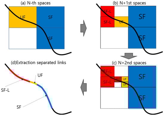 Figure 4 illustrates the dynamic segmentation process. If a grid, as shown in Figure 4a, includes areas without roads, these areas are excluded initially to ensure the segmentation focuses only on road networks. Next, each grid is evaluated for SF status; if the grid is identified as SF, no further segmentation is applied. However, for unstable flow (UF) grids, additional divisions are carried out, as shown in Figure 4b, until all sections are classified as SF or the preset maximum number of divisions is reached. Figure 4c illustrates the segmentation progression, with a minimum of 5 divisions and a maximum of 12. These limits were set to prevent overly large grids, which result from fewer than five divisions, and to avoid segments shorter than an average of 100 m, deemed unsuitable for microsegment speed data on expressways.