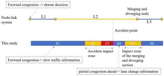 As illustrated in Figure 5, this method is applied to analyze merging/diverging sections and accident impact zones through a direct traffic analysis approach specific to this research. Traditional node–link information systems, which segment data into larger areas, such as L1, L2, and L3, typically provide only average speed data within these broader segments, such as within L2. However, the application of this novel segmentation approach allows for detailed, fine-grained analysis across smaller spaces, divided into sub-segments S1 through S6. For instance, if S5 is identified as a non-converging space, it becomes feasible to pinpoint the exact location of speed changes and assess the impact zone of an accident. This segmentation also allows for an in-depth examination of speed variations across lanes in merging and diverging sections.