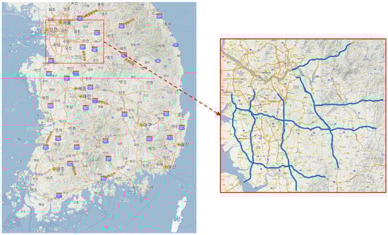 The collected dataset, illustrated in Figure 6, comprised 2775 vehicle data points gathered from expressways in Gyeonggi Province, South Korea, for April 2018. To isolate expressway-specific data, the study used the standard node–link structure provided by an intelligent transportation system. The analysis included 951 nodes and 2133 links across expressways in the Gyeonggi region, providing a comprehensive basis for detailed speed and location assessments.