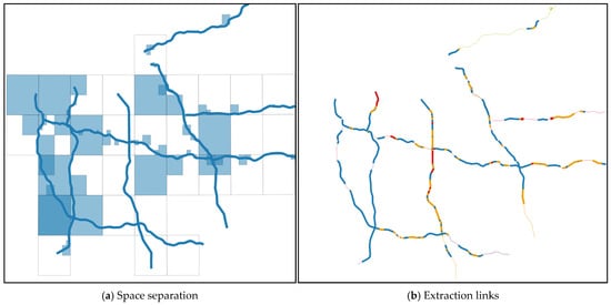 Subsequent overlay analysis was conducted using data from the eight expressway links. Figure 7 provides a visualization of the segmented links: Figure 7a shows the spatial classification based on individual vehicle data from the eight expressway routes, while Figure 7b isolates the segments of each expressway route within the classified spaces. The speed data for these segments are represented using a spectral color scheme, providing a visual differentiation of traffic flow characteristics within each partitioned space.