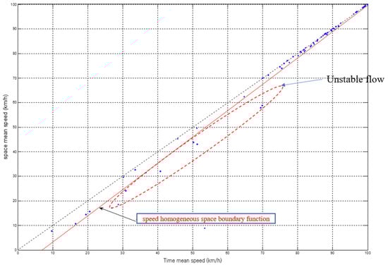 To determine this reference value, stable flow sections on Expressway 1 were analyzed across speed intervals from 30 km/h to 100 km/h, with increments of 10 km/h. These intervals were chosen to capture variations across a realistic range of expressway speeds, yielding a calculated σ′ value of 9.43 km/h. This value was subsequently substituted into Equation (2) to derive Equation (3), providing a quantitative basis for assessing flow stability.