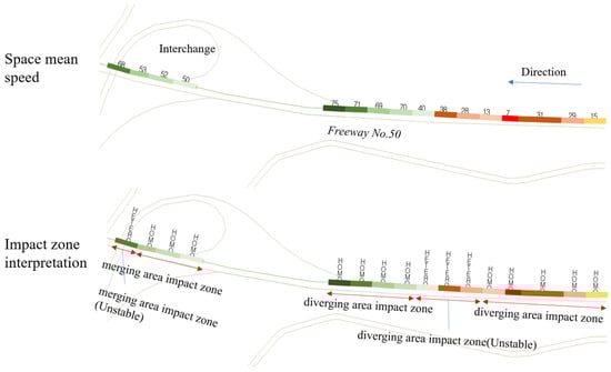 The spatial segmentation of speed-homogeneous areas reveals non-converging segments in merging and diverging zones with increased traffic volume, reflecting unstable flow due to lane-specific speed variations. As illustrated in Figure 9 for Expressway 50, we can observe a comparison between the non-converging speed-homogeneous spaces and the converging spaces upstream. The latter are influenced by exiting vehicles at interchange (IC) diverging points, which induce lane-specific speed differences.