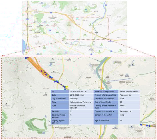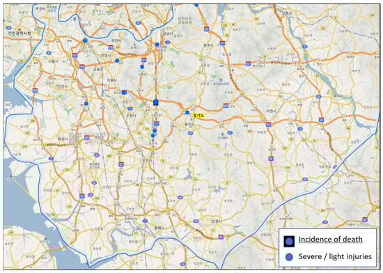 The status of traffic accidents in South Korea was examined to analyze and compare the extracted low-speed sections and unstable traffic flow segments. Based on data from April 2018, 18 traffic accidents occurred between the peak traffic hours of 9 AM and 11 AM, 1 of which was fatal, as depicted by the GIS data in Figure 10.