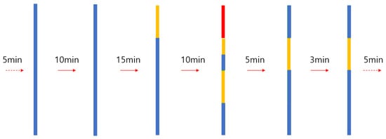 Table 3 presents a time series analysis of traffic flow characteristics in 10 min intervals, classified by spatial segmentation for a segment of Expressway 50. The spectral color scheme in each figure visually represents the mean speed in kilometers per hour (kph) for each homogeneous segment, indicating segment-specific speed values. As observed in Table 3, congestion began at the Yongin IC sorting section at 10:15 AM, followed by congestion near the accident site at 10:35 AM, which led to the development of an accident impact zone extending upstream by 10:45 AM. Following the accident, an unstable flow was observed in the rearward segment, transitioning into low-speed segments that progressively lengthened and moved upstream.